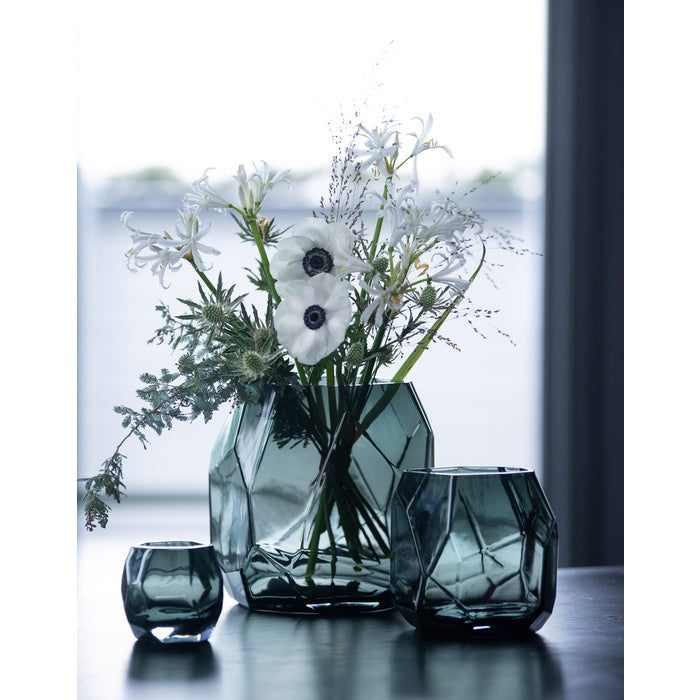 För att färgsätta serien av vaser och lyktor, som består av tre olika storlekar i tre färger, hämtade Knut & Kjartan inspiration från den nordiska vintern – med bas i två mörka toner och en gyllene accent. Formspråket gör att vaserna och lyktorna står lika vackert ensamma som tillsammans med vårblommor eller levande ljus under vintermörkret. Reflektionerna fångar och speglar ljuset genom årstiderna. Formen är robust men samtidigt mjuk, och varje del blir en skulptur i sig själv.