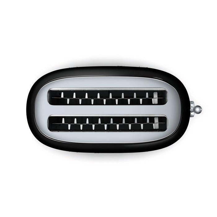 Brödrost för fyra skivor från Smeg i 50-tals Retro Style. Tillverkad i lackerat stål med kromade, belysta knappar. Extra breda rostfack. 6 olika rostningsnivåer. Upptiningsfunktion. Uppvärmningsfunktion. Bagel-program som rostar endast ena sidan. Separat stoppknapp för att avbryta programmet. Uttagbar smulbricka. Sladdvinda under brödrosten. Gummifötter för stabilitet. Total effekt: 2000 W.
