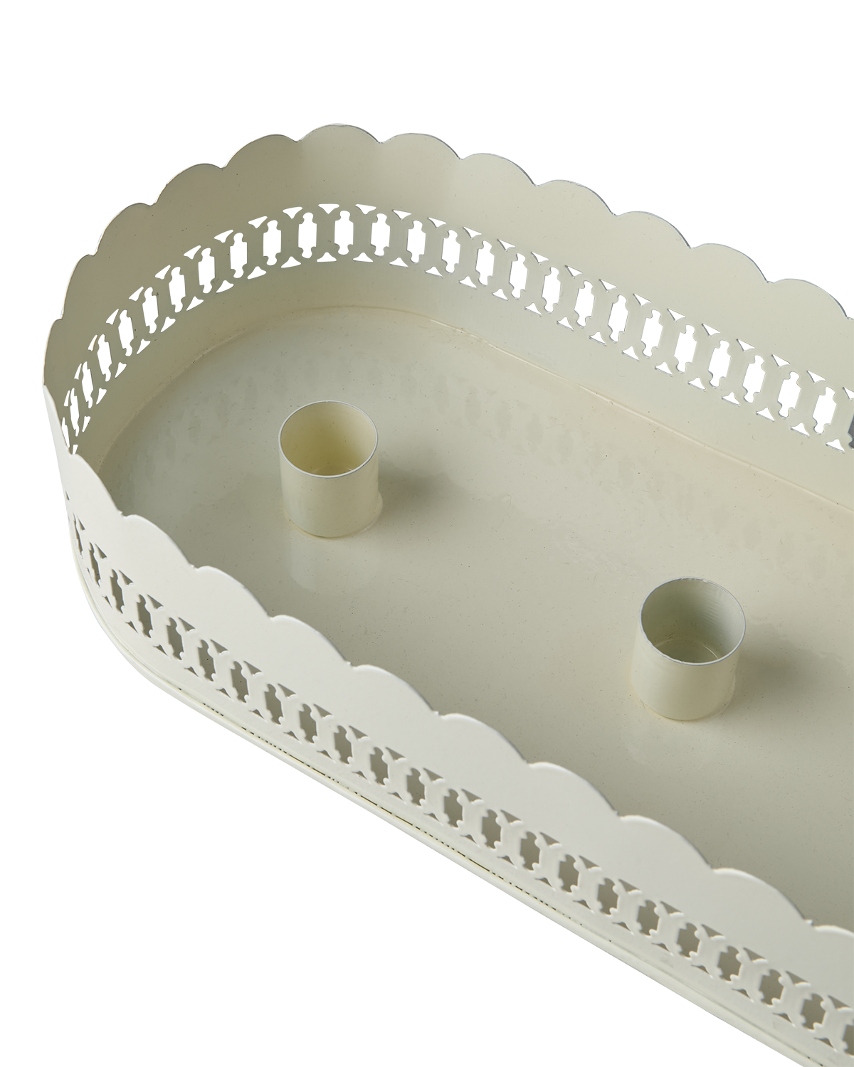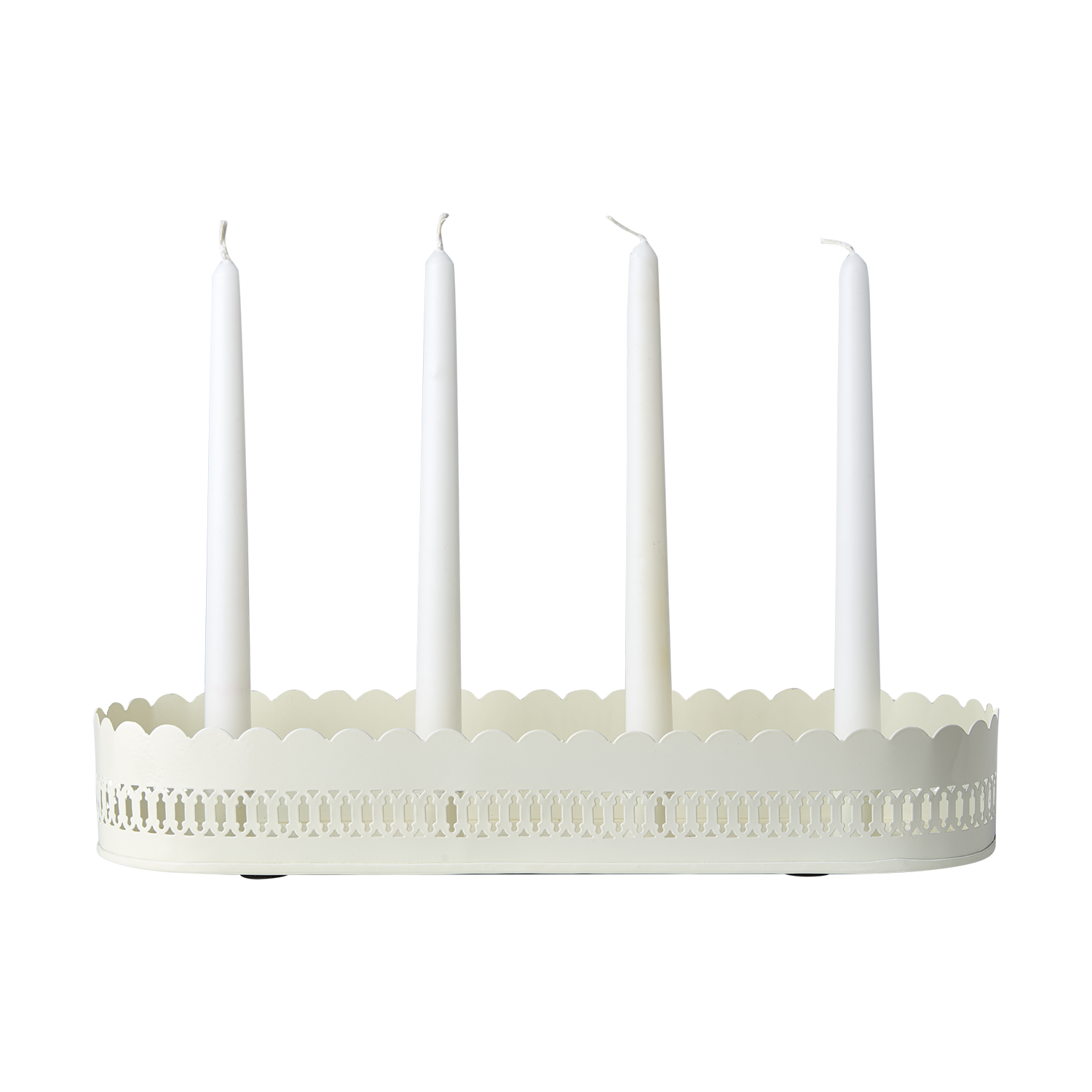 Denna produkt är tillverkad av järn. Den har en elfenben färg. Ø2,2 cm ljus. Måtten är bredd 14 cm, höjd 6.5 cm. Produkten väger 0.5 kg.