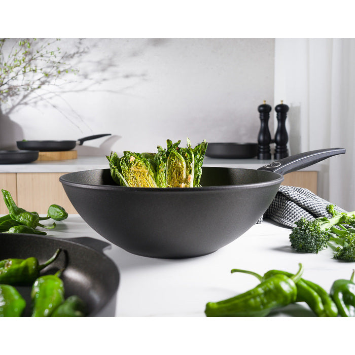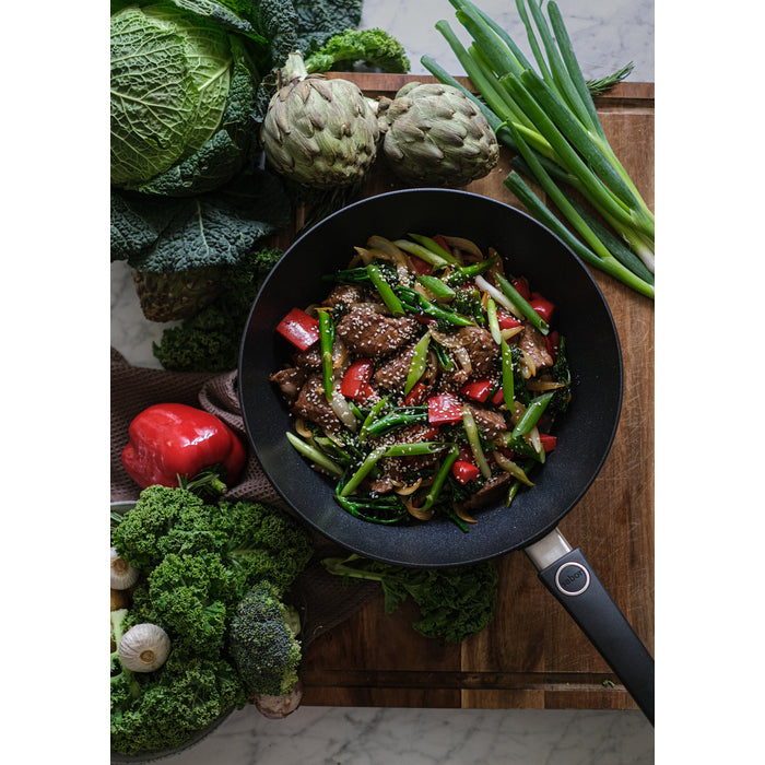Sabor Premium wokpanna 30 cm gör woklagning till en ren fröjd. Pannan har en mycket jämn och effektiv värmefördelning, vilket gör att även maten längs kanterna snabbt blir varm. Den generösa storleken gör det enkelt att röra om och kasta ingredienserna under stekning. Det ergonomiska handtaget gör pannan bekväm att arbeta med och hjälper dig att uppnå perfekta resultat varje gång.