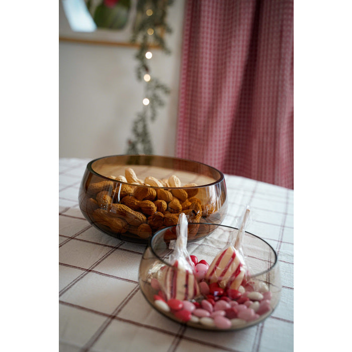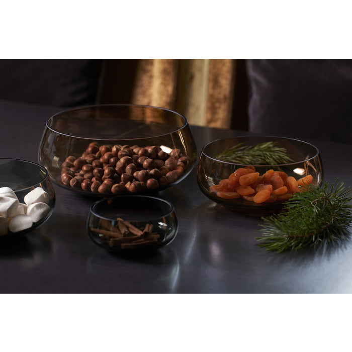 ROCKS-skålarna finns i tre storlekar: liten Ø13,5/H6 cm, medium Ø20/H9 cm och stor Ø26/H11,5 cm, i färgerna kolgrå och topas. ROCKS minivas är 8,5 cm hög och kommer också i kolgrått och topas. Alla är munblåsta och handgjorda av yrkesstolta glasblåsare. Varje exemplar är unikt och äkta – ingen är exakt lik den andra.