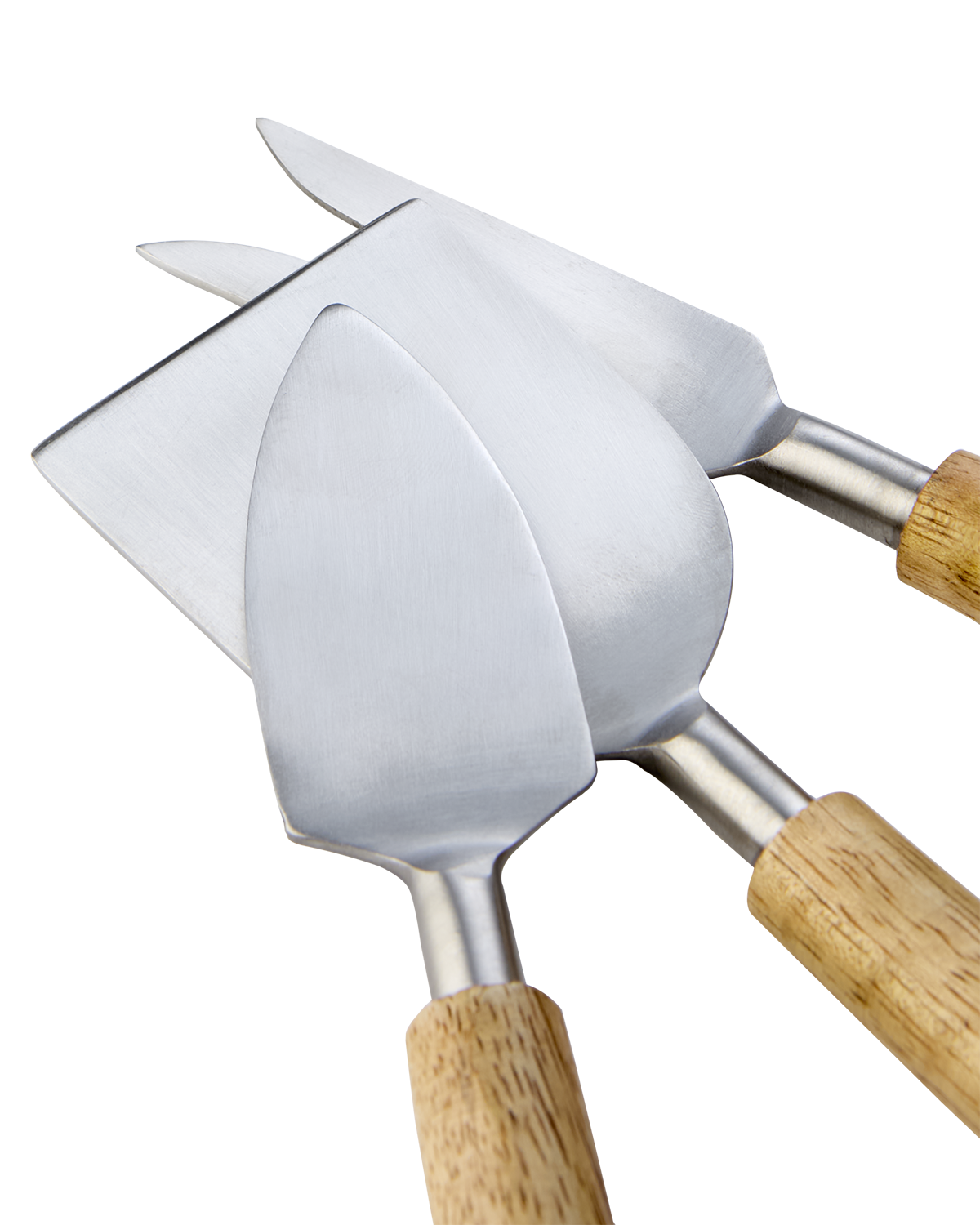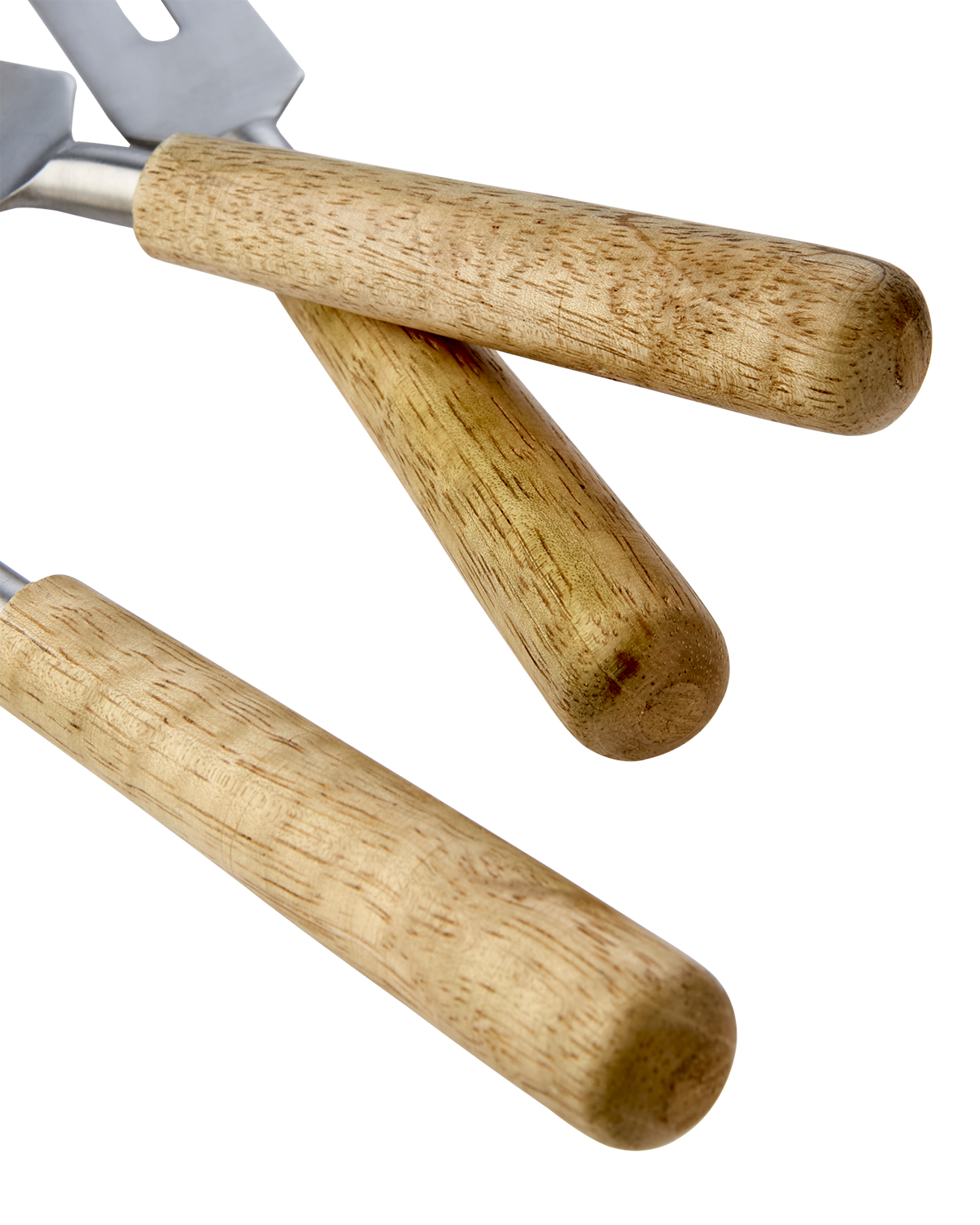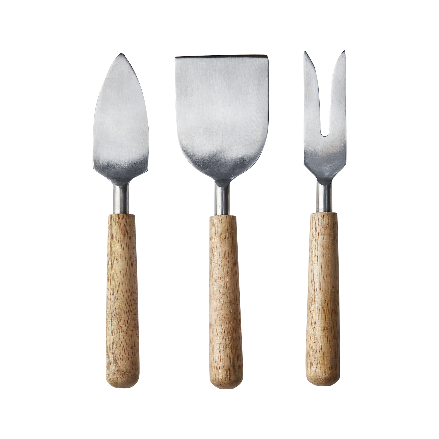 Detta ostknivset kombinerar trähandtag med blad i rostfritt stål för en elegant och funktionell känsla. Setet består av tre olika ostknivar, perfekta för att skära, bryta och servera både hårda och mjuka ostar. Den varma träytan skapar ett rustikt uttryck som lyfter varje ostbricka. Matcertifierade och bör diskas för hand.