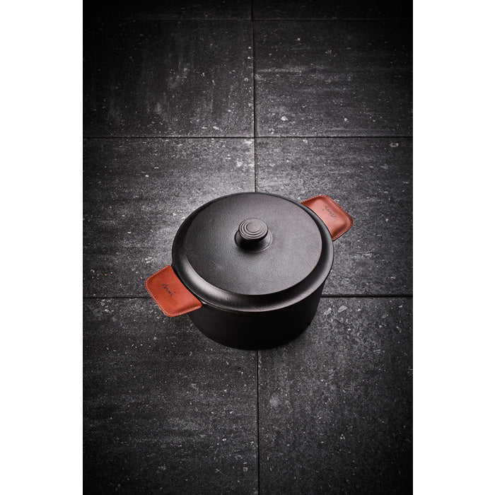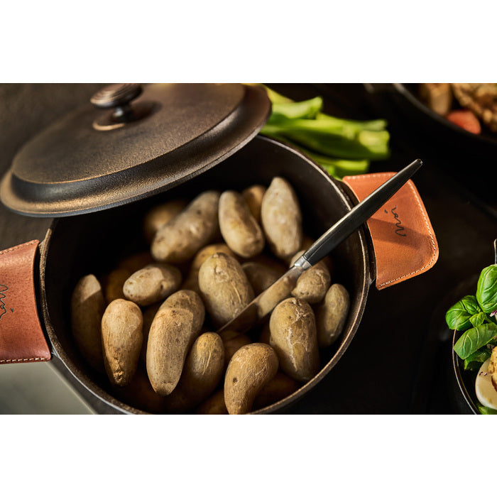 Moi hölster är tillverkat i 100 % läder i en vacker konjaksfärg med präglad Moi-logotyp. Två lager mjukt läder skyddar händerna mot värme och gör det enklare att hantera varma kärl under matlagning. Det perfekta tillbehöret – särskilt anpassat för Moi gjutjärnsgrytor. Levereras i 2-pack.