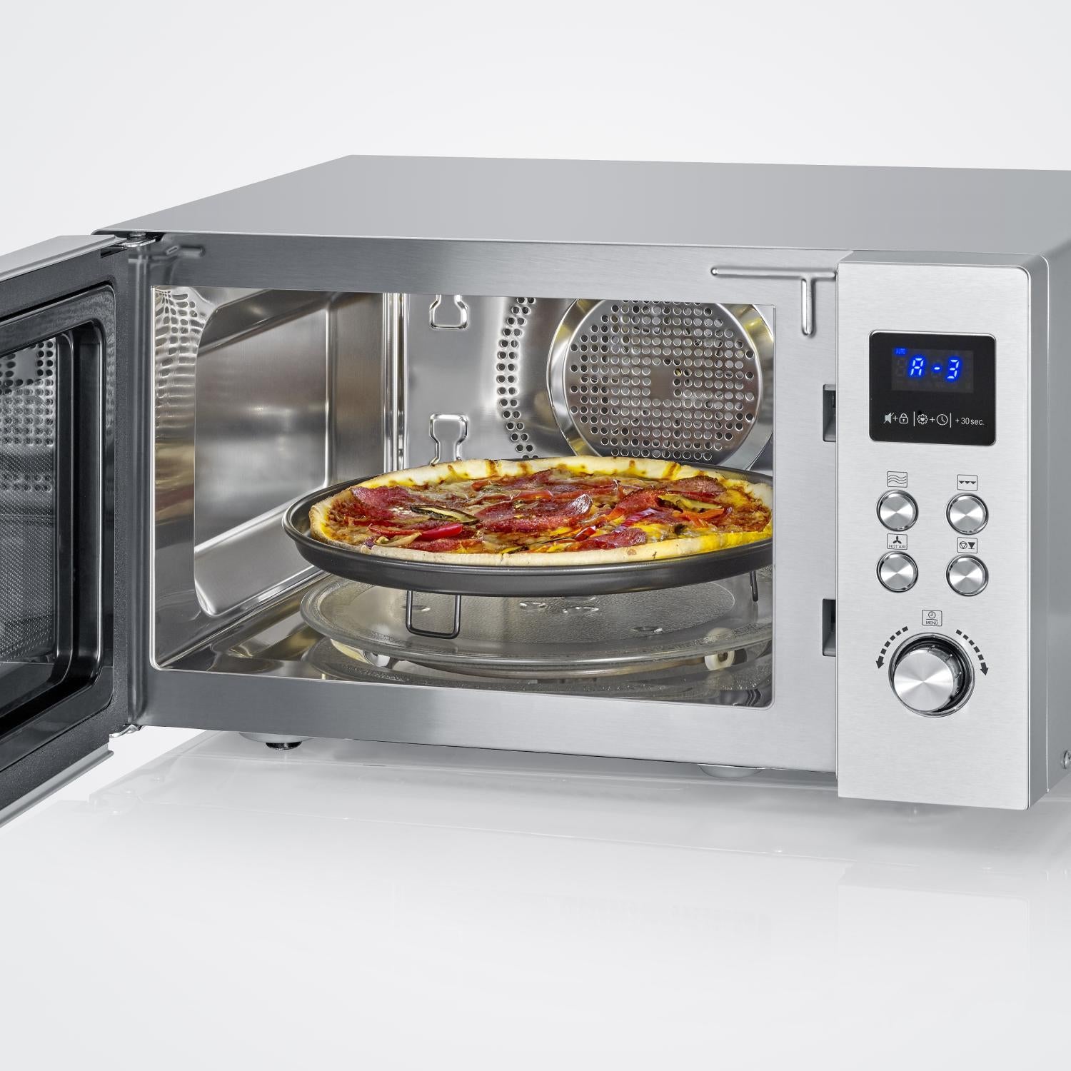 Dessutom ingår en non-stick belagd pizzatallrik i den här modellen, vilket gör att du kan tillaga vilken fryspizza som helst och få en knaprig och god yta. Mikrovågsugnen är också utrustad med grilleffekt, vilket ger dig möjlighet att få den knapriga ytan som du älskar.