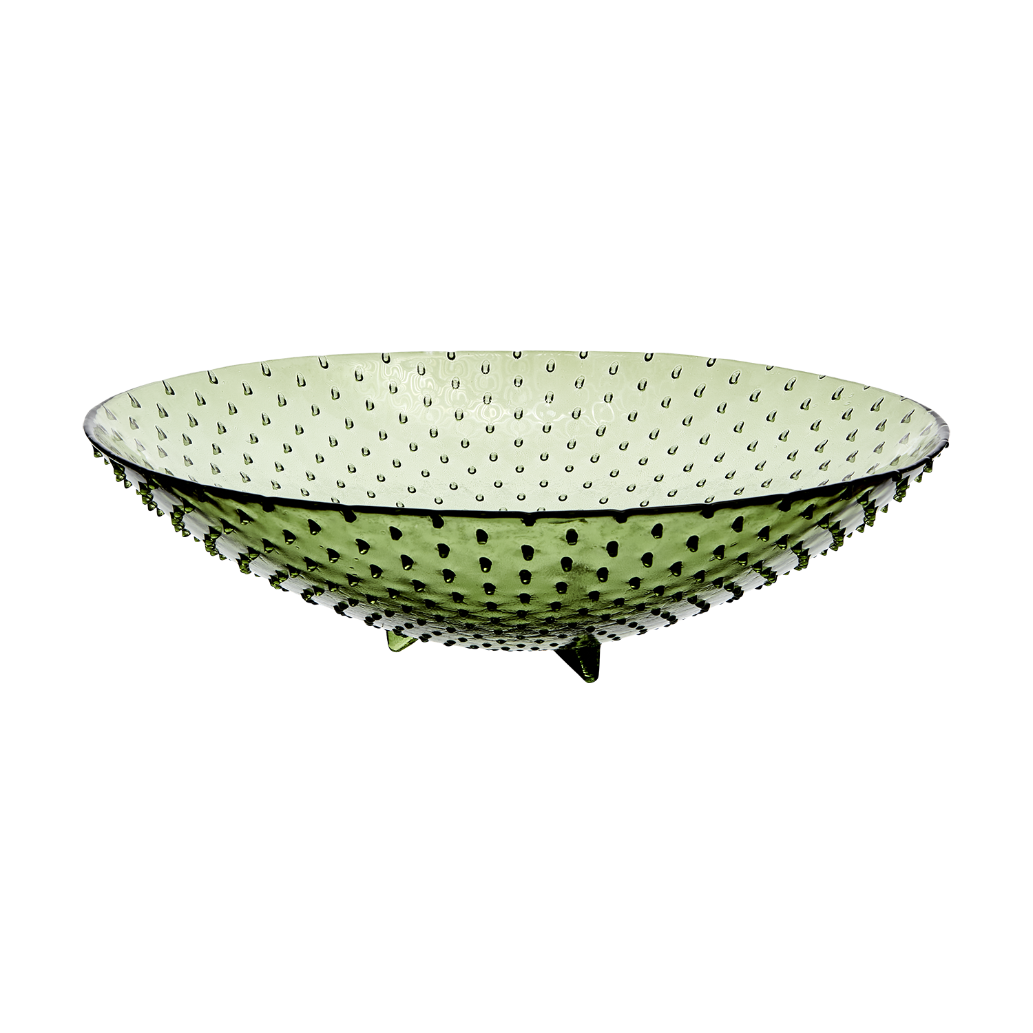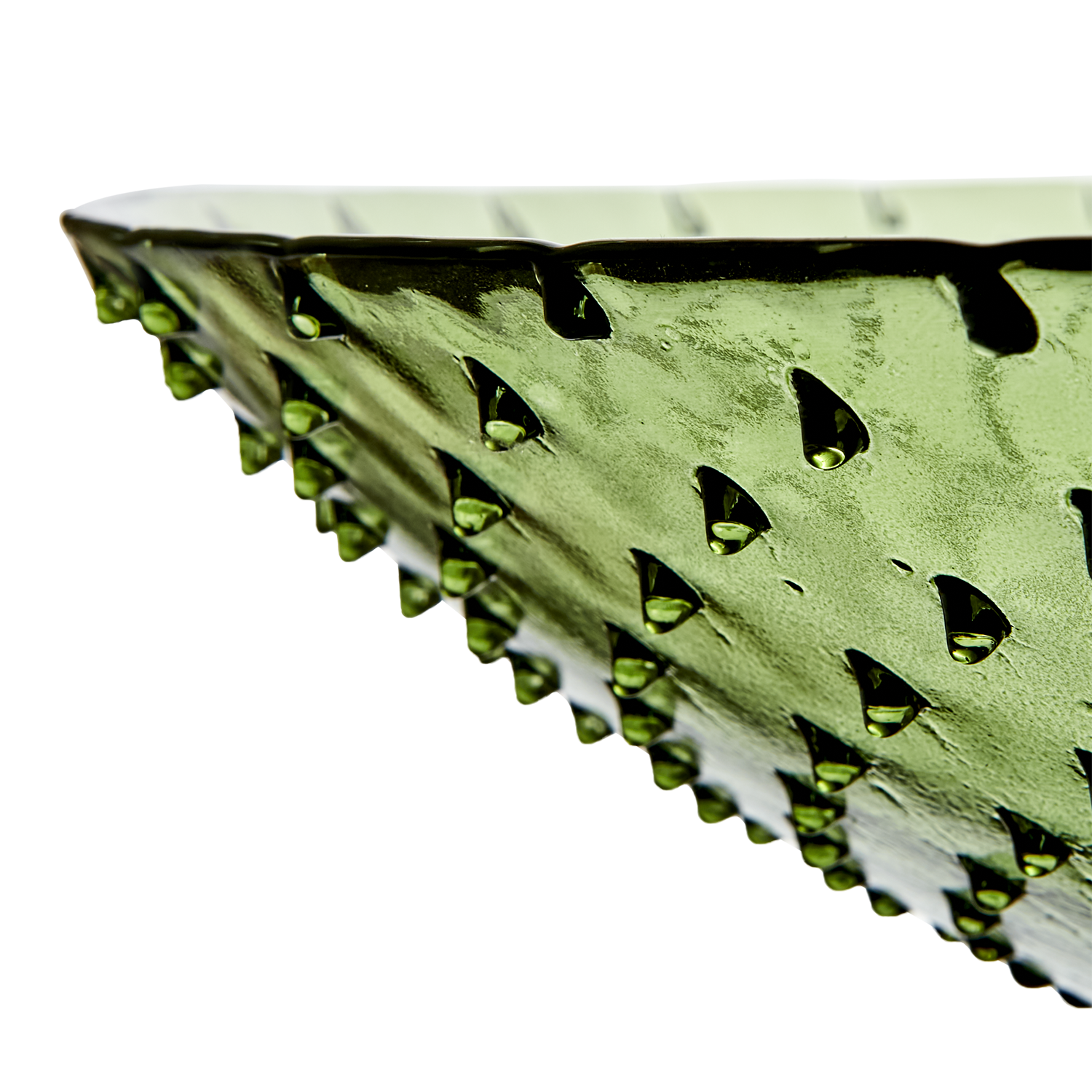 Denna produkt är tillverkad av återvunnet glas. Den har en ljusgrön färg. Diskas för hand. Måtten är diameter 40 cm, höjd 11 cm. Produkten väger 2.05 kg.