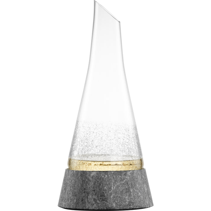 Karaffen är handgjord i kristallglas och har ett krackelerat, unikt mönster. Detta konstverk framhäver både skörheten och styrkan i äkta kristall. Basen av täljsten garanterar stabilitet och blir ett extraordinärt blickfång på bordet. Stenen utmärks dessutom av sin kylande funktion, som är särskilt uppskattad av vinälskare. Genom att kyla basen i frysen eller kylskåpet kan den under servering hålla vinet vid perfekt temperatur. Ett underlägg till basen medföljer också.